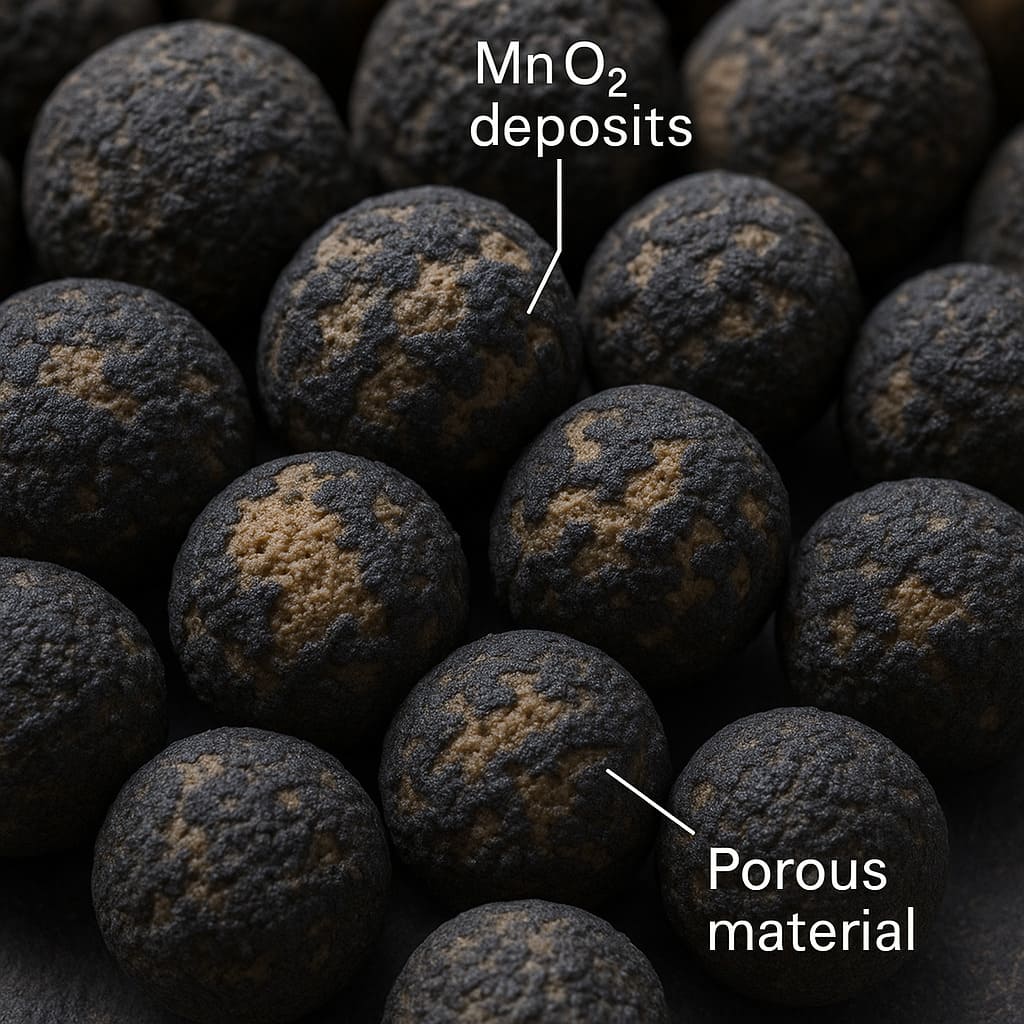 Hạt “già”: sau 1–2 năm, bề mặt bị phủ bởi cặn khác (silica, CaCO₃, FeOOH) làm giảm độ bám của lớp MnOx, dễ bong. Nếu hàm lượng mangan trong nước cao hoặc nước nhiễm nhiều tạp chất thì sau 12 tháng hạt đã bị “lão hóa” nặng.